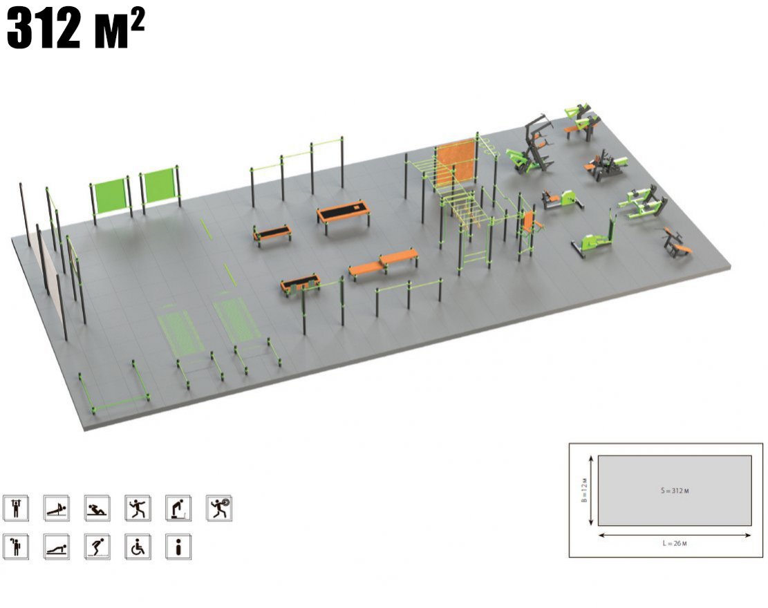Набор также включает горизонтальный велотренажёр Power-1817 с безынерционной нагрузочной системой, эллипсоид Power-1818 с безынерционный нагрузочный механизм, скамью для пресса и гиперэкстензию для тренировок на свежем воздухе, предназначенные для укрепления мышц нижней части тела, ягодиц и брюшного пресса, а также для тренировки нижней части спины. Цвет — графитовый, материал — металл.