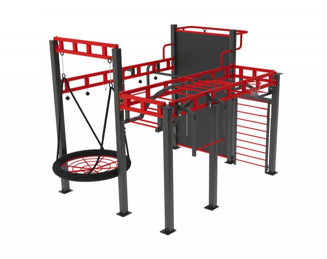 • В комплект входит: канат, гимнастические кольца, турник, шведская стенка, рукоход, баскетбольное кольцо, скалодром, груша, качель-гнездо, скамья