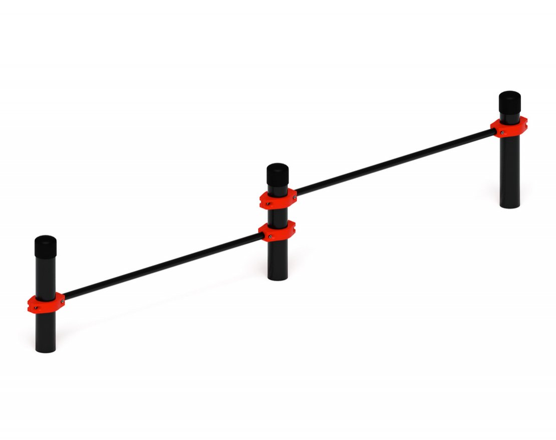 Перекладины, выполненные из труб диаметром ⌀32 мм и толщиной стенок 2.8 мм, крепятся к опорным стойкам при помощи хомутов, состоящих из двух разъёмных частей, соединённых винтами М₁₀. Это обеспечивает надёжное крепление перекладин и позволяет регулировать их высоту на двух уровнях: 40 см и 20 см от земли.
