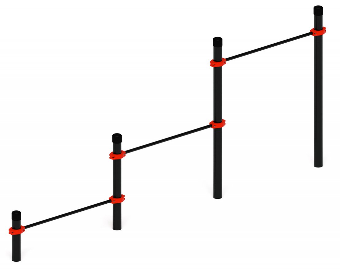 Воркаут-комплекс, размещённый на улице, представляет собой функциональное и безопасное спортивное оборудование, которое может стать отличным дополнением для спортивной площадки. Комплекс состоит из четырёх опорных столбов, выполненных из стальной трубы диаметром ⌀89 мм и толщиной стенки ⌀3,5мм. В верхней части каждой стойки установлена заглушка, соответствующая стандартам ГОСТ 17379–2001, что обеспечивает надёжность конструкции.