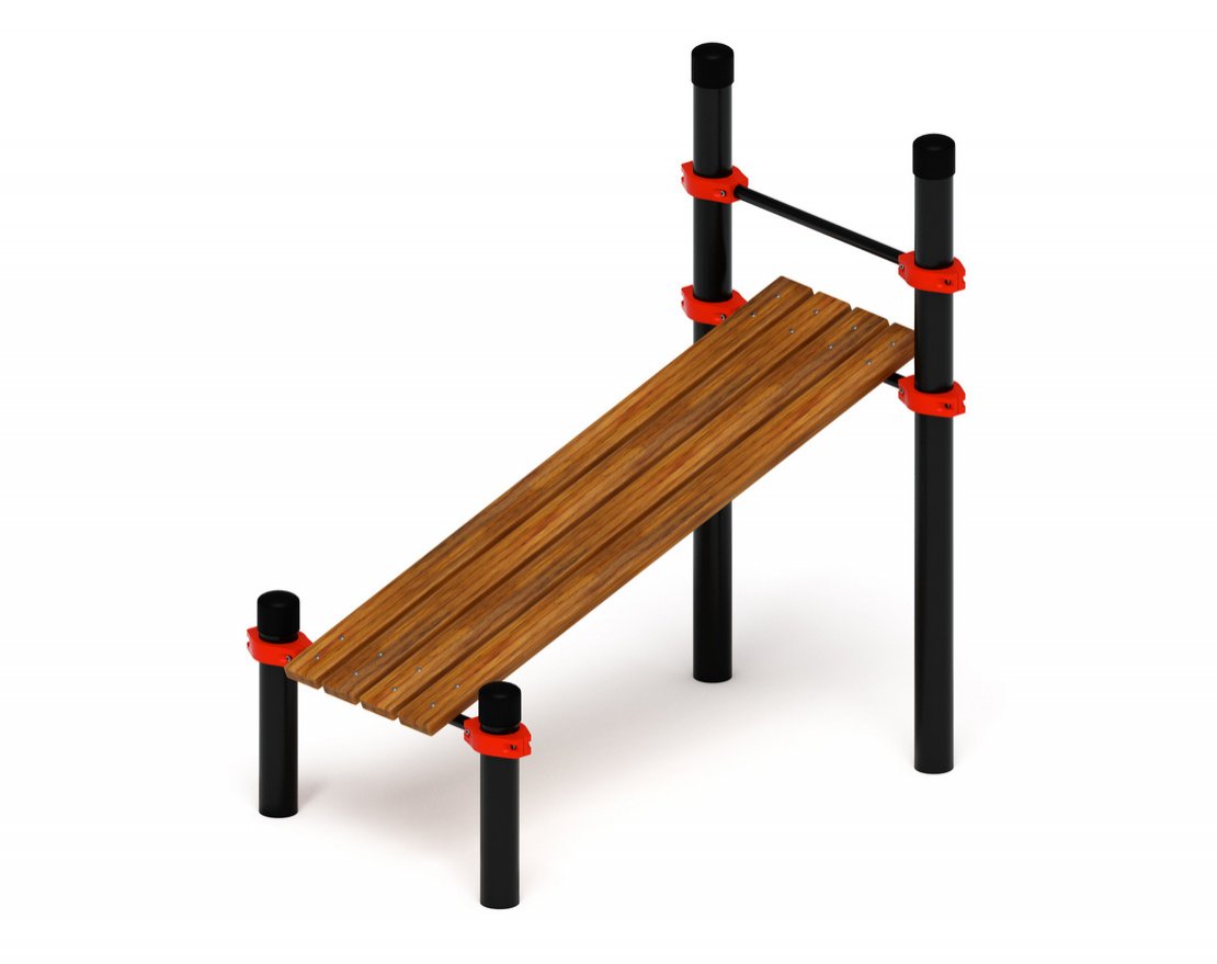 Комплекс для занятий на улице представляет собой сборно-разборную конструкцию, состоящую из четырёх опорных столбов и скамьи для пресса. Вот некоторые особенности этого комплекса: