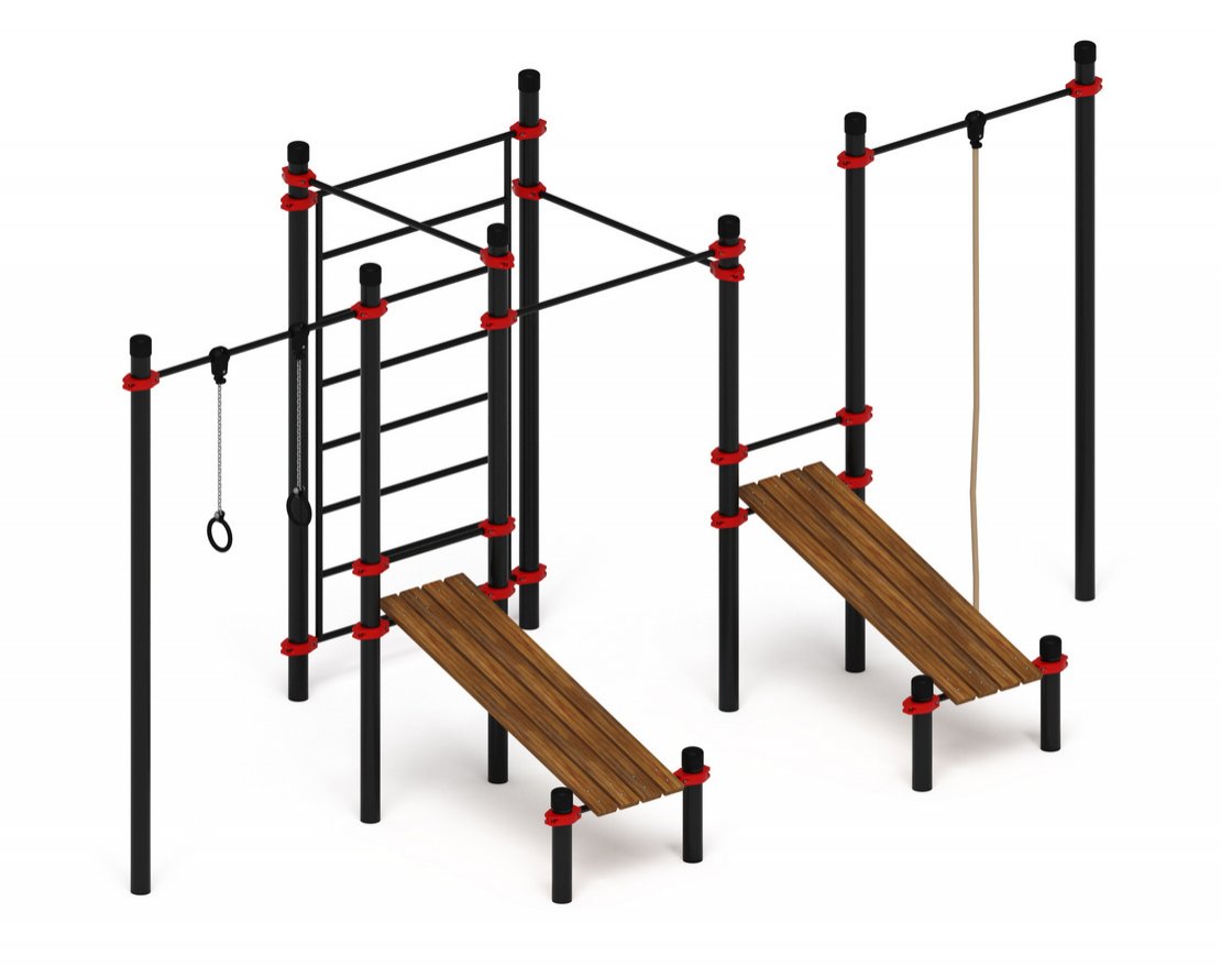 Воркаут-комплекс — это многофункциональный спортивный снаряд, который может стать отличным местом для тренировок на свежем воздухе. Он состоит из 12 опорных металлических столбов, выполненных из трубы диаметром 89 мм с толщиной стенки 3,5 мм. В верхней части каждой стойки установлена пластиковая полусферическая заглушка или заглушка по ГОСТ. Сварка всех элементов осуществляется в заводских условиях, что обеспечивает надёжность конструкции.