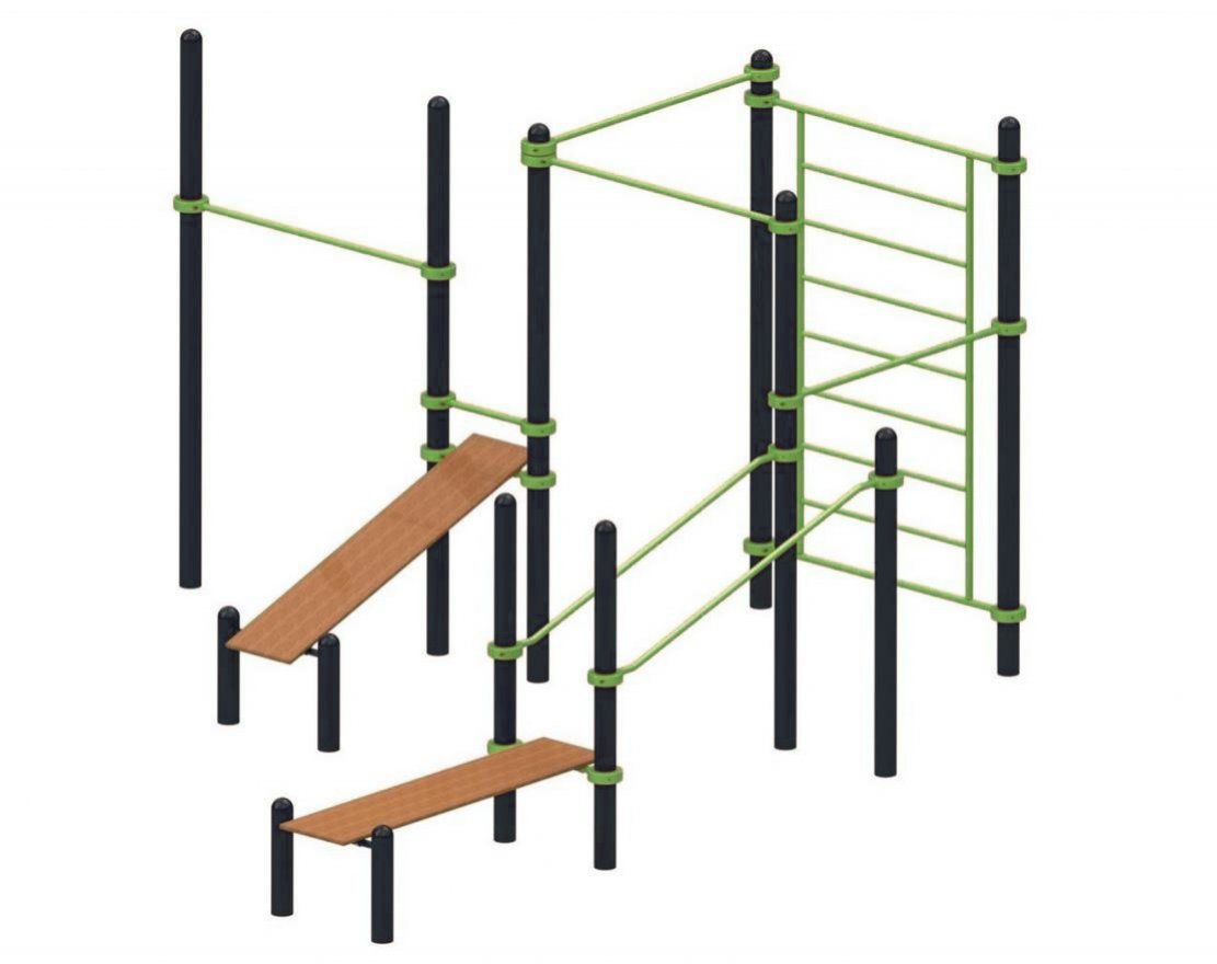 Тренажёры изготовлены из прочной стали и прослужат долгое время. Порошковая краска, которой они покрыты, устойчива к повреждениям и воздействию погодных условий. Это позволяет вписать комплекс в любой дизайн-проект загородного дома, дачи, школы или дворовой территории.