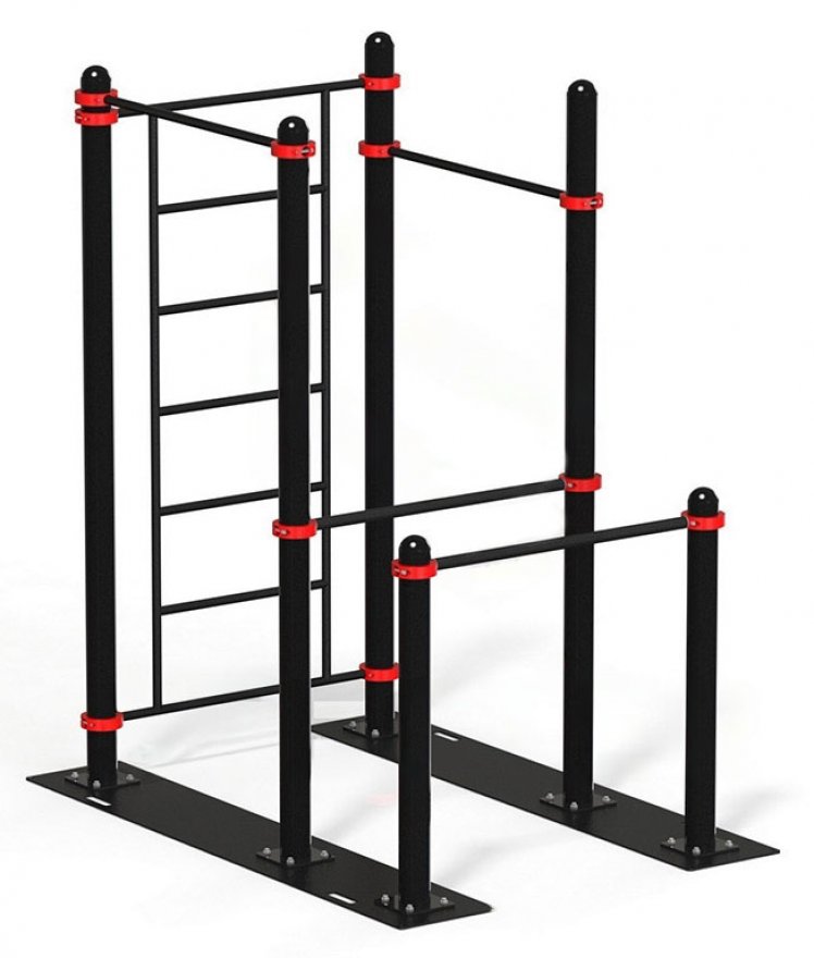 Все элементы спортивного комплекса выполнены из прочной стали и покрыты атмосферостойкой порошковой краской, нанесённой методом электростатического напыления и последующего обжига в печи, что обеспечивает долговечность и устойчивость к внешним воздействиям.