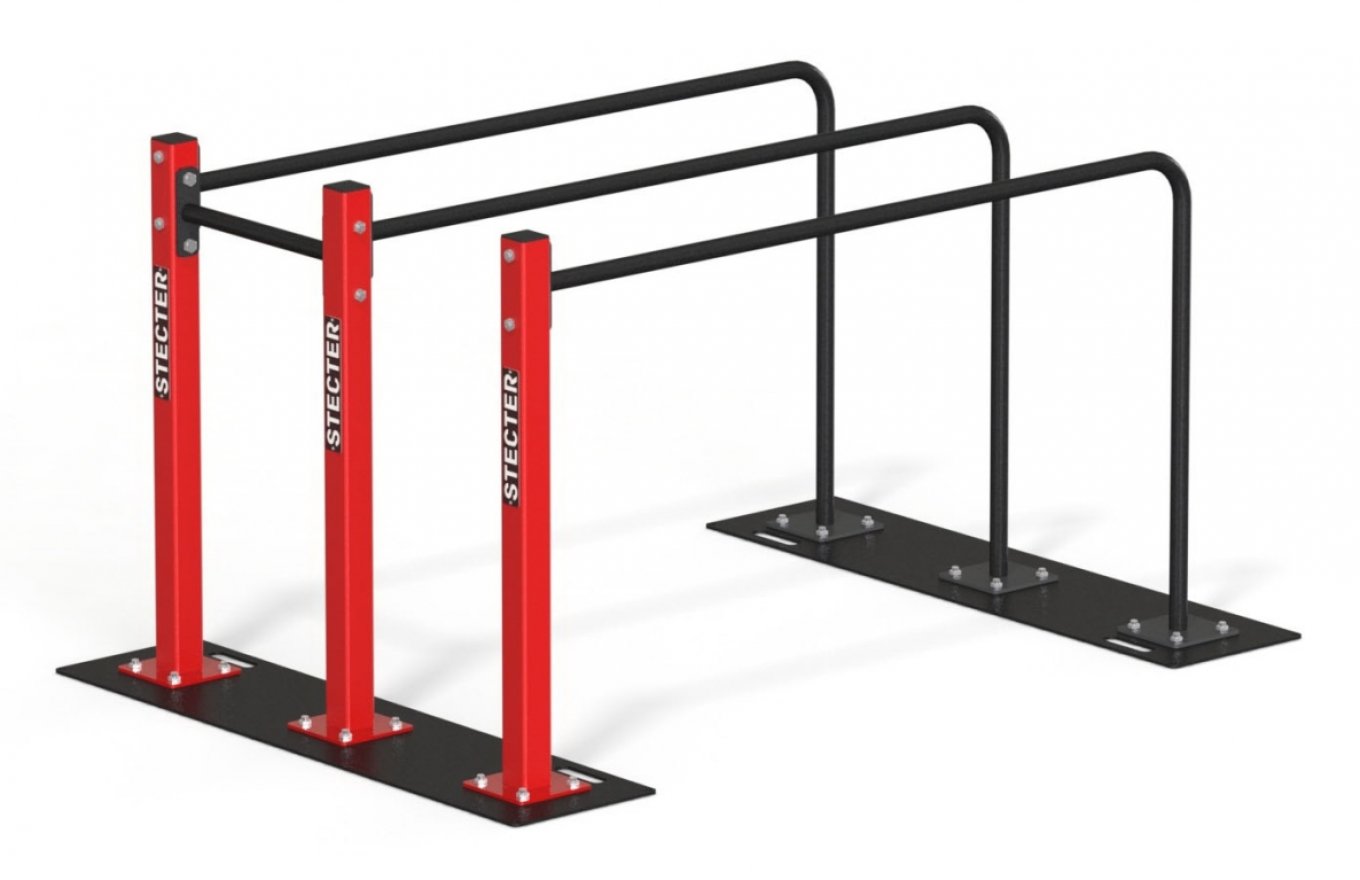Спортивный комплекс представляет собой сборную конструкцию, состоящую из трёх опорных столбов, поручней и креплений. Комплекс выполнен из металлических элементов, что обеспечивает его прочность и долговечность. Конструкция легко монтируется и демонтируется, что делает её удобной в установке и транспортировке.