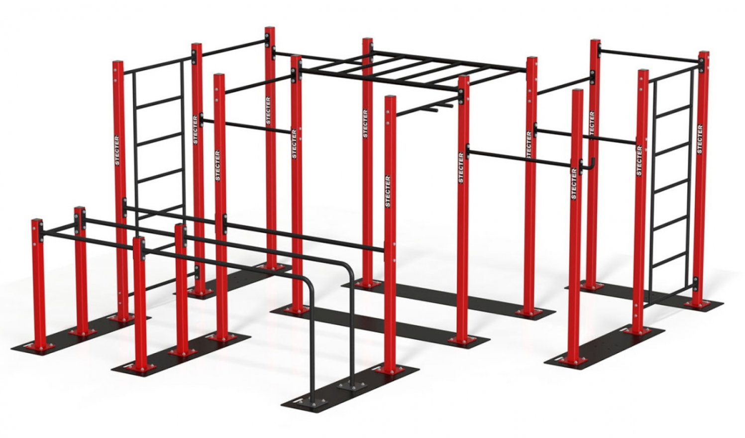 Спортивный комплекс представляет собой сборную конструкцию из металлических элементов. Он состоит из семнадцати столбов, изготовленных из профильной трубы, и девяти перекладин, которые можно установить на разной высоте. Также в комплект входят перекладина с трубками для упражнений узким хватом, сдвоенные брусья, рукоход и две шведские стенки. Предусмотрен крюк для дополнительных приспособлений.