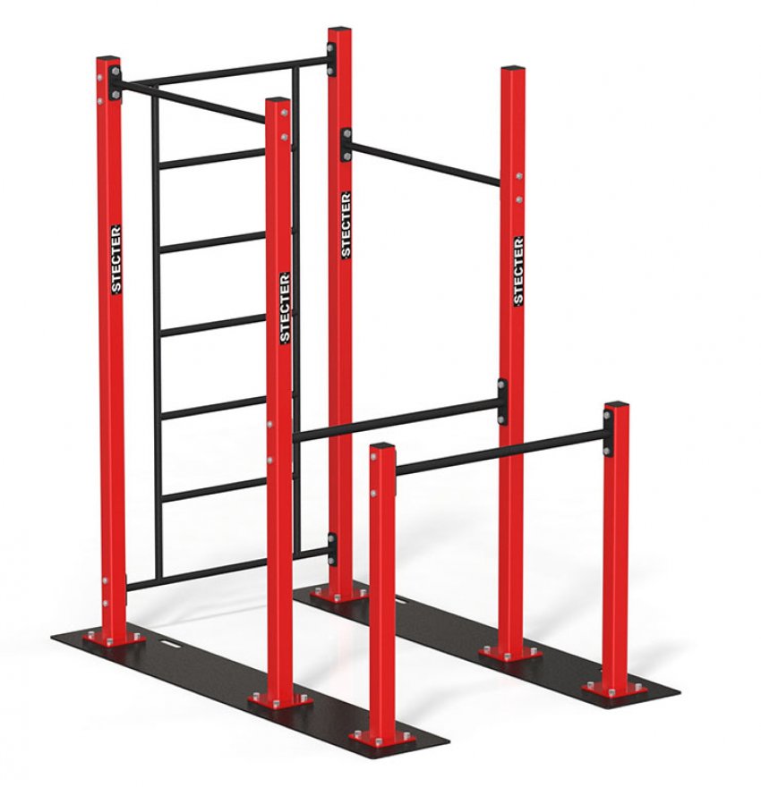 Спортивный комплекс представляет собой сборную конструкцию, состоящую из металлических элементов. Комплекс разборный, что обеспечивает удобство монтажа и транспортировки. Он включает в себя шесть опорных столбов, две перекладины, шведскую стенку и два поручня.