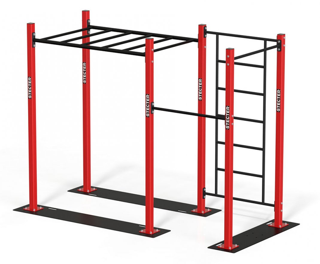 Спортивный комплекс представляет собой сборную конструкцию из металлических элементов. В комплект входят шесть опорных столбов, две перекладины, рукоход и шведская стенка. Комплекс легко монтируется и демонтируется благодаря разборной конструкции.