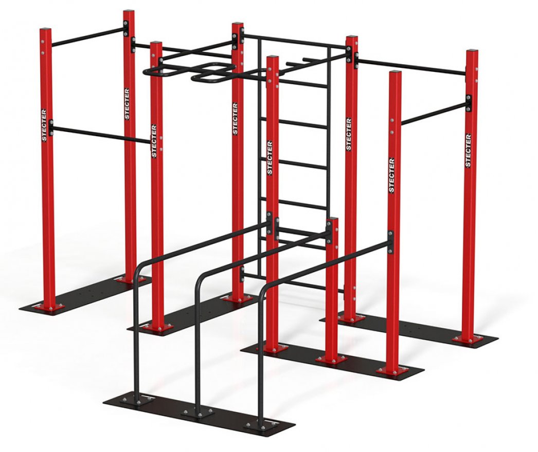 Спортивный комплекс представляет собой сборную конструкцию из металлических элементов. Он состоит из девяти опорных стоек, шести перекладин, одной перекладины с узким хватом, рукохода, сдвоенных брусьев, шведской стенки и креплений.