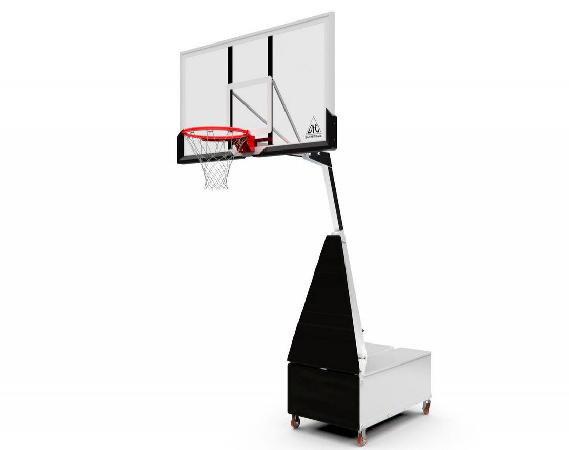 Баскетбольная мобильная стойка имеет щит из поликарбоната. До использования стойки для устойчивости на раму должно быть размещено 250 кг (в комплект не входит).