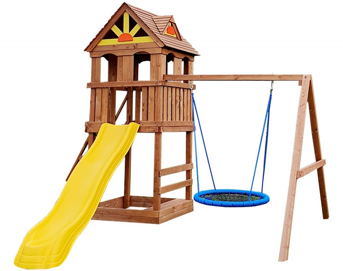 Площадка спроектирована с учётом всех требований безопасности. Скруглённые торцы, утопленные крепёжные элементы и увеличенная толщина бруса гарантируют, что дети не получат травм. А увеличенная гарантия до пяти лет даёт уверенность в долговечности конструкции.