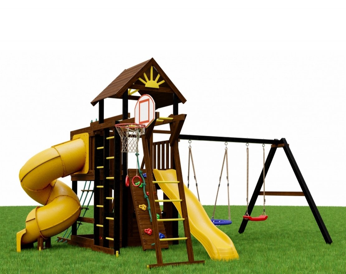 - Все элементы изготовлены из надёжных износостойких материалов, что обеспечивает долговечность и безопасность площадки.