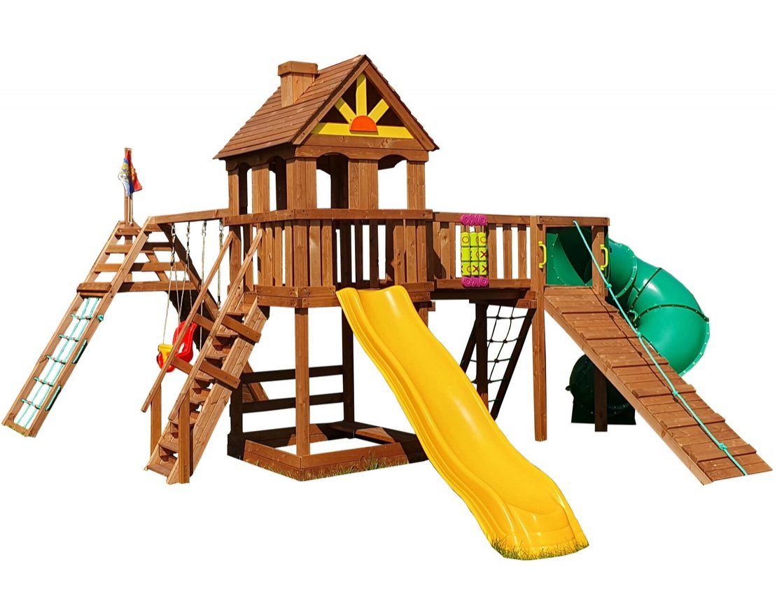 Особенности конструкции. Качельный модуль имеет улучшенную конструкцию, а горка выполнена из пластика и имеет длину 2,7 метра. Все выступающие части бруса и доски скруглены, а головки металлического крепежа утоплены. Это обеспечивает безопасность детей.