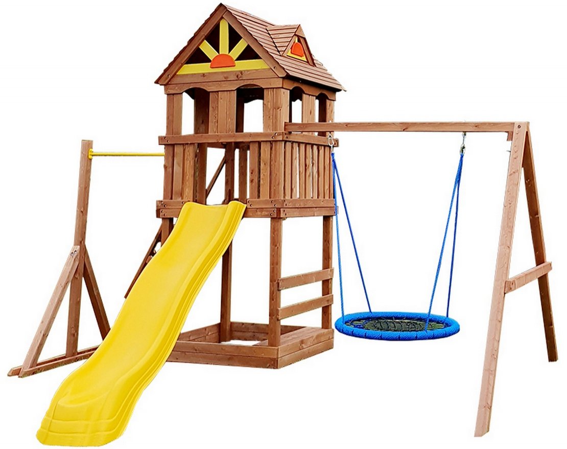 Комплектация городка включает башню, лестницу с перилами, скат длиной 2,7 метров, качели-гнездо, модуль с турником и песочницу.