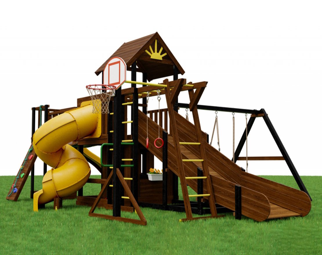 - Разнообразие модулей. Комплекс включает разнообразные элементы, такие как стенка для скалолазания с зацепами, баскетбольное кольцо, протяжённый мост, шведскую стенку, канат и многое другое. Всё это позволяет детям развивать ловкость, координацию движений и физическую активность.