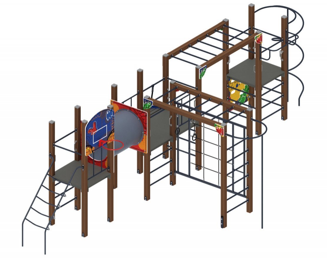 • В комплект входит: брусья, верёвочная лестница, канат, шведская стенка, рукоход, баскетбольное кольцо, туннель