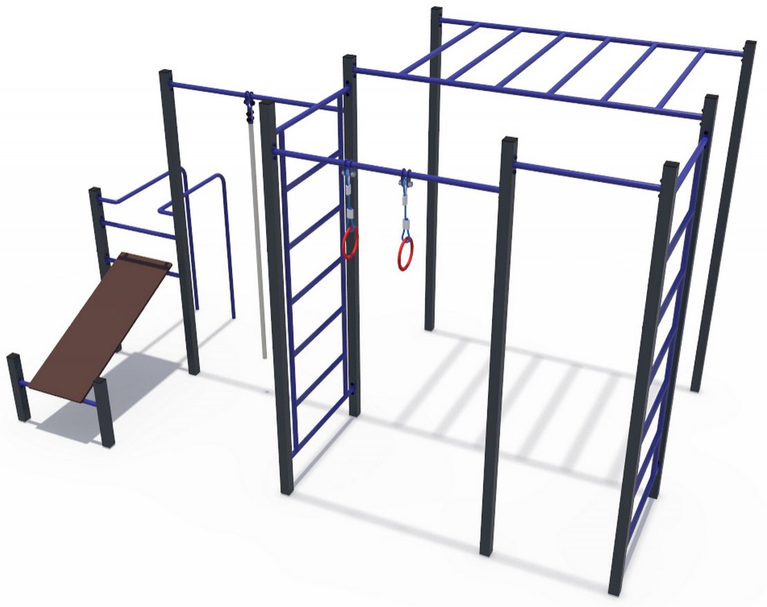 • В комплект входит: брусья, канат, гимнастические кольца, турник, шведская стенка, рукоход, скамья для пресса