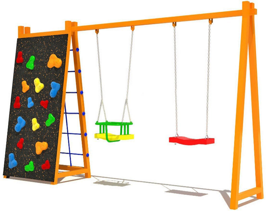 Сразу две качели (классическое сидение и детское защитное) принесут одинаковый восторг как совсем маленьким участникам игр, так и повзрослевшим. Для более активного отдыха предусмотрена имитация стены для скалолазания и лесенка-клеточка.