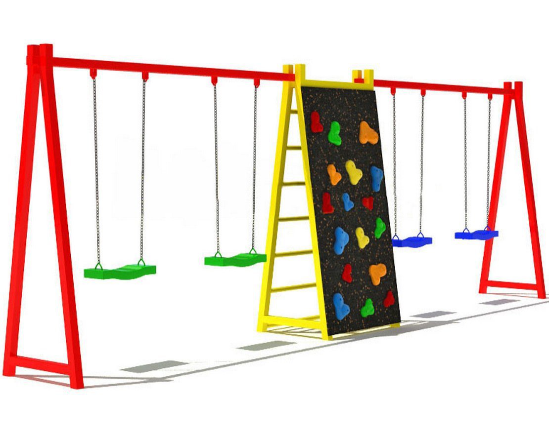 Настоящий полноценный спортивно-развлекательный детских комплекс не оставит равнодушным ни одного ребёнка. Площадка спроектирована таким образом, что одновременно может занять целую компанию детей самого разного возраста, предложив им разнообразные развлечения: качели, лесенки для лазания и даже настоящую стену для скалолазов.