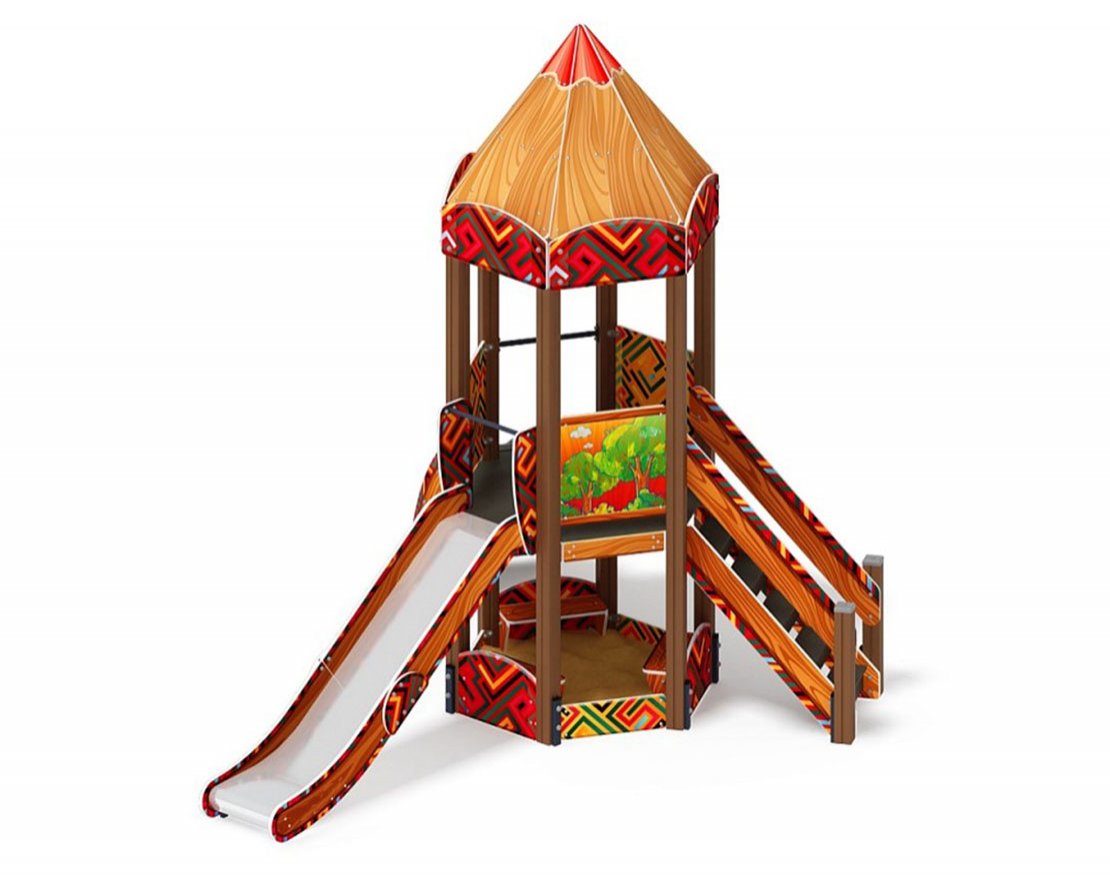 Выполнена из шести клеёных брусьев 100х100 мм высота бруса 3000 мм; пол из ламинированной фанеры, с антискользящим покрытием мм толщиной 18 мм по лагам из ламинированной и влагостойкой фанеры. Над башней имеется шести- скатная крыша из фанеры толщиной 12 мм, кромки фанеры тщательно шлифованы, фанера окрашена с нанесением принта. Крыша поставляется в сборе. Внешний периметр крыши закрыт декоративными арками из влагостойкой фанеры толщиной 18 мм, габарит арки-780х380 мм. Отметка пола башни от планировочной отметки площадки 1200мм. Высота башни 3970 мм.