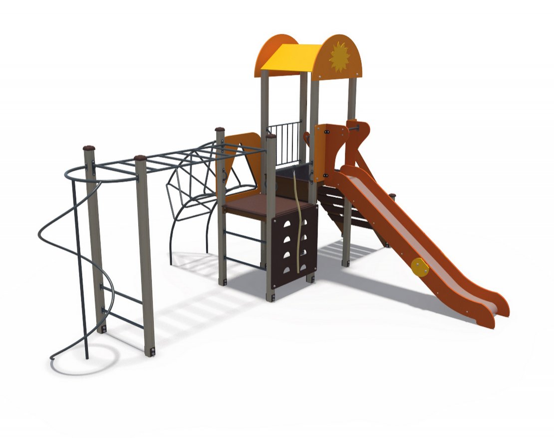 Комплекс имеет привлекательный внешний вид и продуманную конструкцию, которая обеспечивает безопасность и комфорт для детей. Он включает в себя разнообразные элементы, такие как горки, лестницы, качели и другие, которые помогут развить физическую активность и воображение детей.