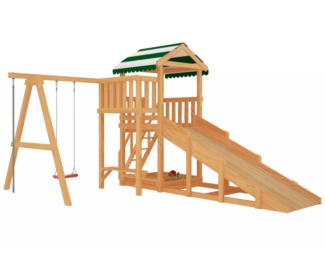 Площадка предназначена для одновременного использования несколькими детьми. Она поставляется без покраски и отверстий для крепления, но её сборка, как правило, несложна для опытного мастера. В комплект входит лекало для разметки отверстий.