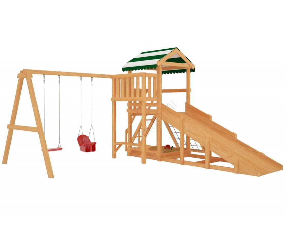 По бокам от башни крепится рама для качелей, на которой можно установить два элемента на выбор. Качели «Лодочка», «Люкс» или другие качели со спинкой понравятся как маленьким детям, так и школьникам.