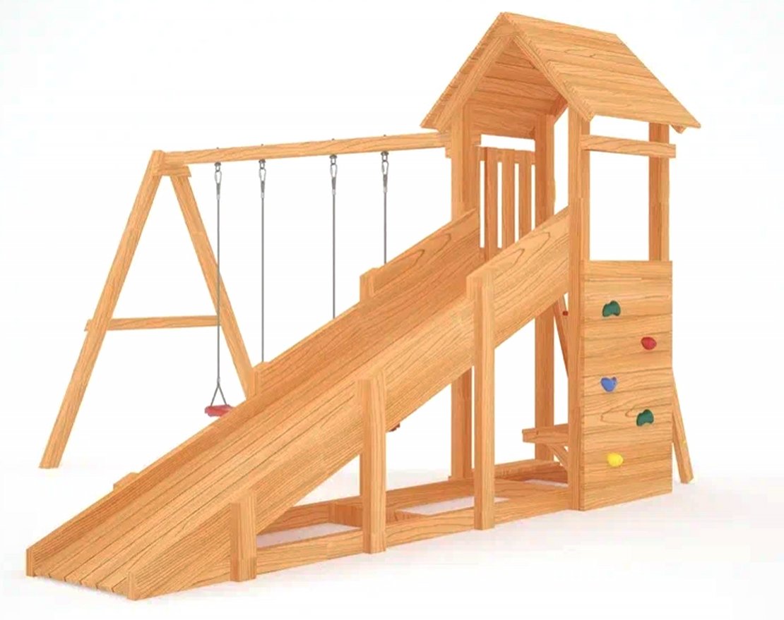 Представляем вам детскую площадку, которая станет отличным местом для игр на свежем воздухе. Площадка выполнена из натуральных и экологически безопасных материалов, таких как шлифованный клеёный брус. Края бруса скруглены, что исключает возможность получения заноз и ссадин.