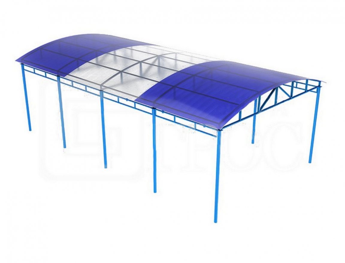 Навес изготавливается из металлической трубы диаметром 76мм, трубы размером 50*25мм, 40*20мм, и 25*25мм, окрашенных полимерно-порошковой краской, устойчивой к воздействию неблагоприятных погодных условий и ультрафиолета. Крыша выполнена из поликарбоната. Длина 8400 мм, ширина(глубина) 4500 мм, высота 3000 мм.