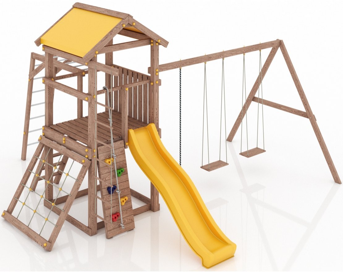 Детская площадка изготовлена в соответствии с ГОСТ Р 52168–2012. Несущие элементы и опоры выполнены из клеёного бруса карельской сосны: