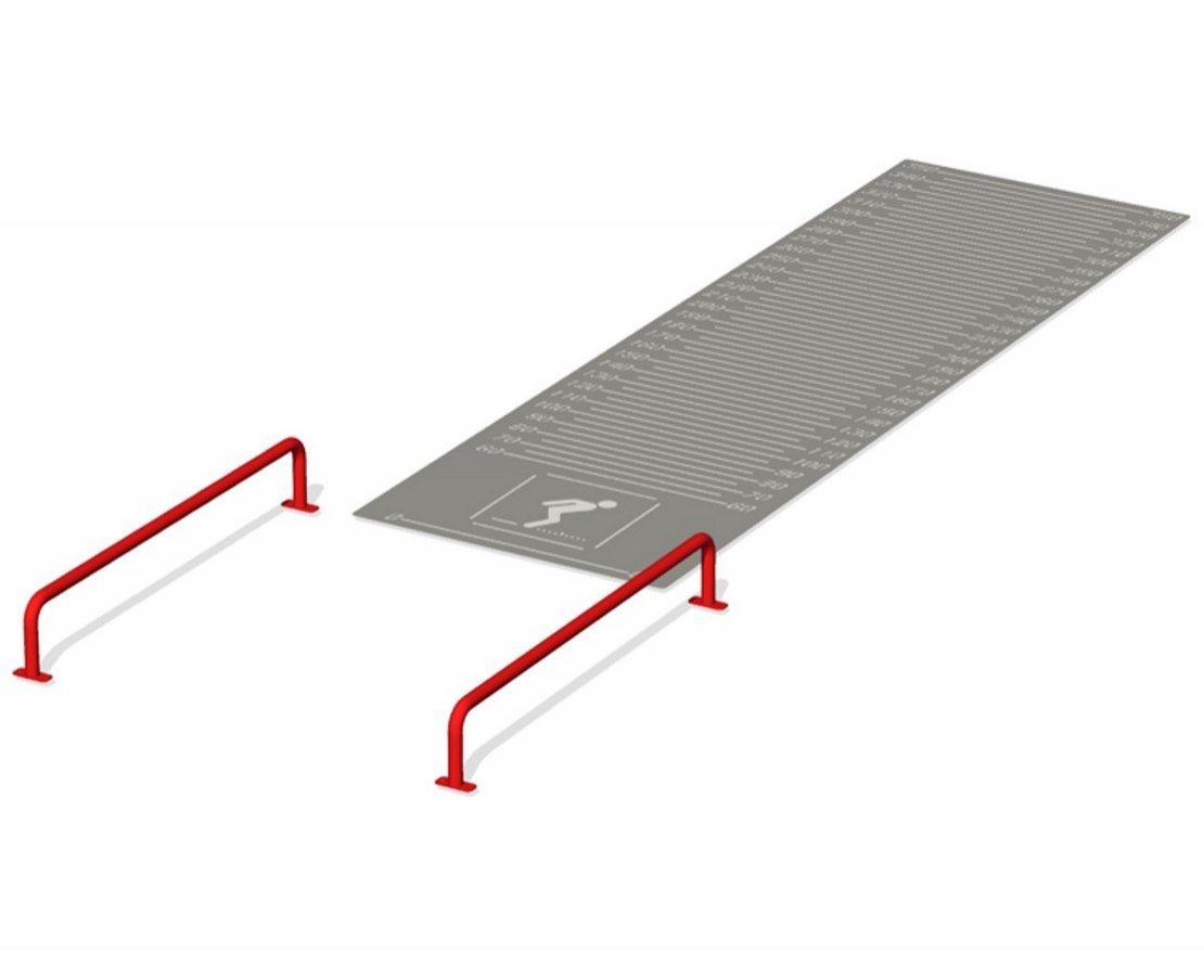 Пиктограмма и линейка на металлическом листе трафарета позволяют точно измерить результат прыжка. Линейка имеет разметку с шагом через каждые 5 и 10 сантиметров в диапазоне от 50 сантиметров до 3,2 метра.