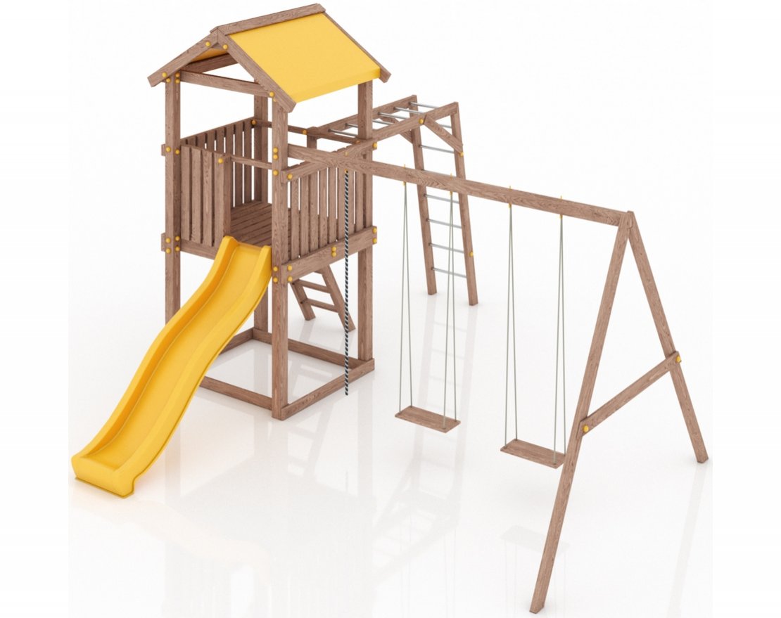 Площадку можно дополнить пластиковой горкой, которая комплектуется по цвету и может быть подключена к скату с водой для создания мини-аквапарка. Также в комплект входят качели с двумя сиденьями и лестница с плоскими ступеньками из массива карельской сосны.