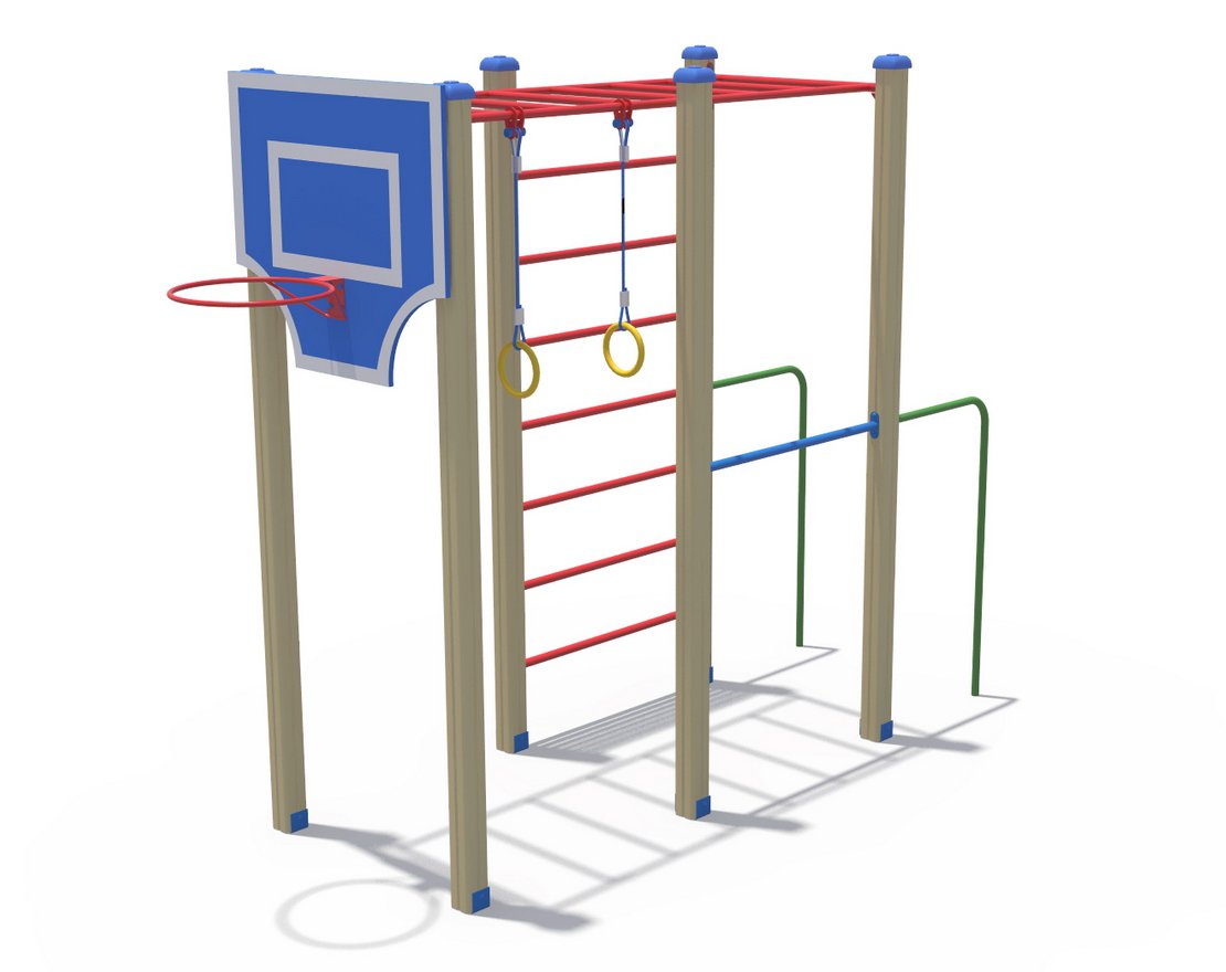 Спортивный комплекс предназначен для детей от 7 лет. Несущие столбы комплекса должны быть выполнены из клееного бруса сечением 90x90 мм.