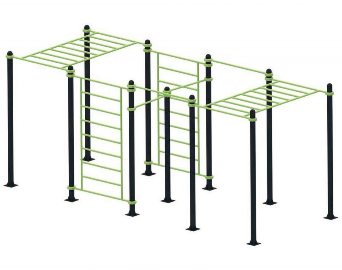 Комплекс оснащён хомутами, которые позволяют регулировать высоту элементов и менять их расположение в пространстве. Это делает установку подходящей для людей разного роста и уровня подготовки.