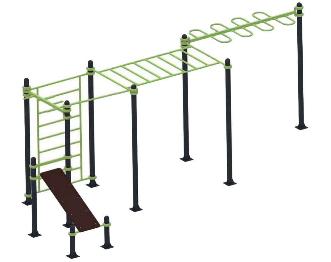 Уличный спортивный комплекс включает в себя турник, шведскую стенку, рукоходы и скамью для пресса.
