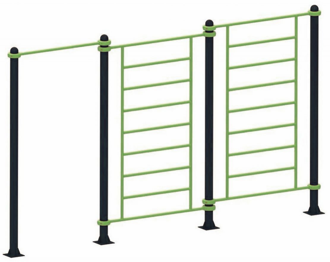 Универсальный атлетический комплекс состоит из двух шведских стенок, турника и благодаря хомутам позволяет варьировать расположение и высоту входящих элементов, что делает его отличным выбором для спортивных площадок и дворовых территорий.