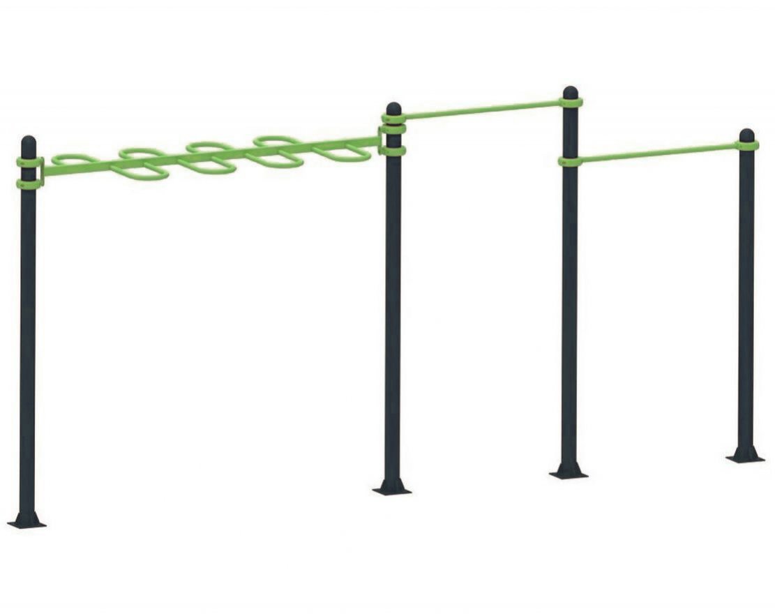 Комплекс представляет собой набор спортивных снарядов, которые подходят для занятий на свежем воздухе. Он может быть установлен как на частной территории, так и на общественных площадках.
