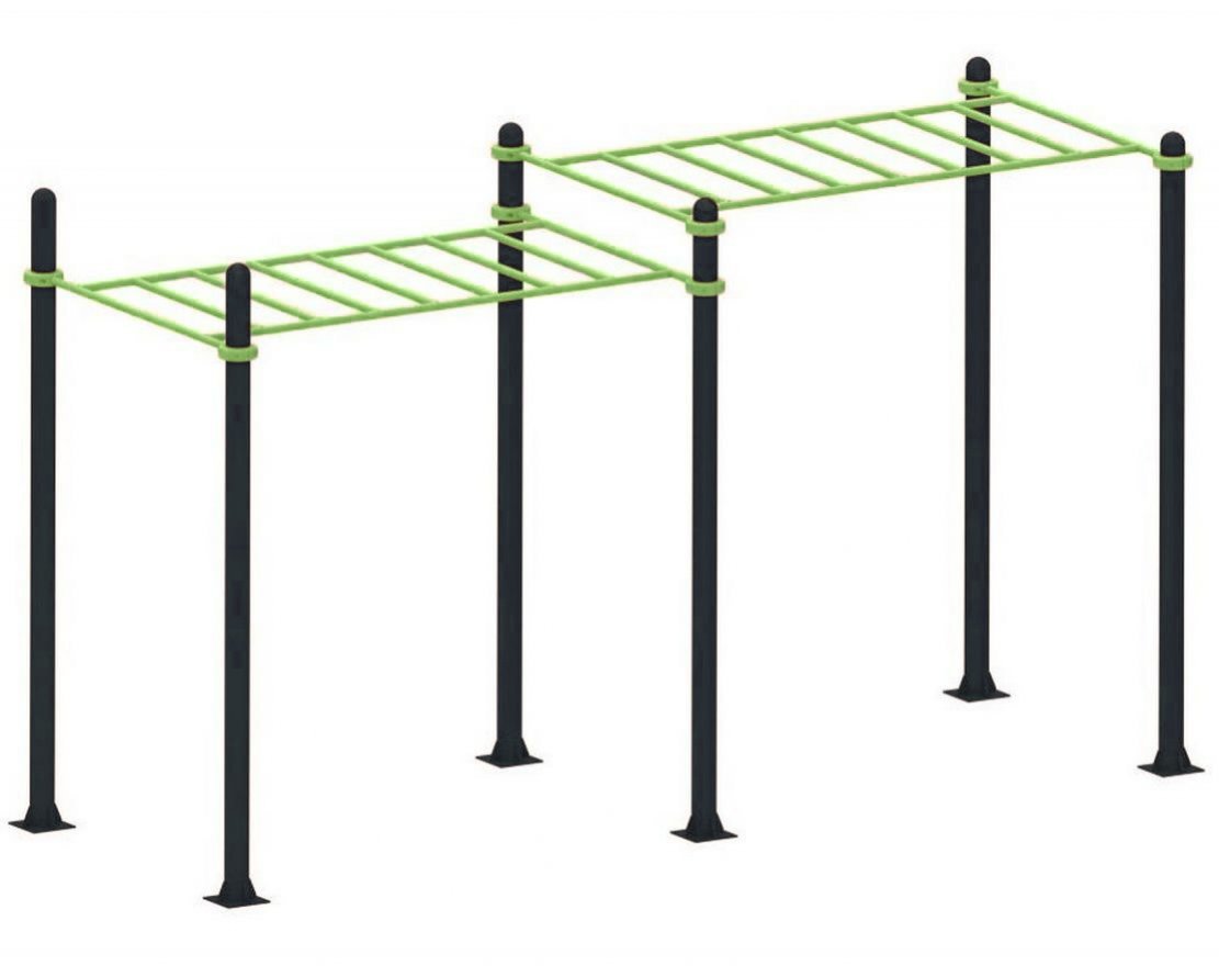 Комплекс представляет собой двухуровневую конструкцию, состоящую из элементов, которые регулируются по высоте при помощи хомутов и могут быть адаптированы под рост пользователей. Комплекс подходит как для взрослых, так и для детей. Он изготовлен из прочной стали и обладает высокой износостойкостью.