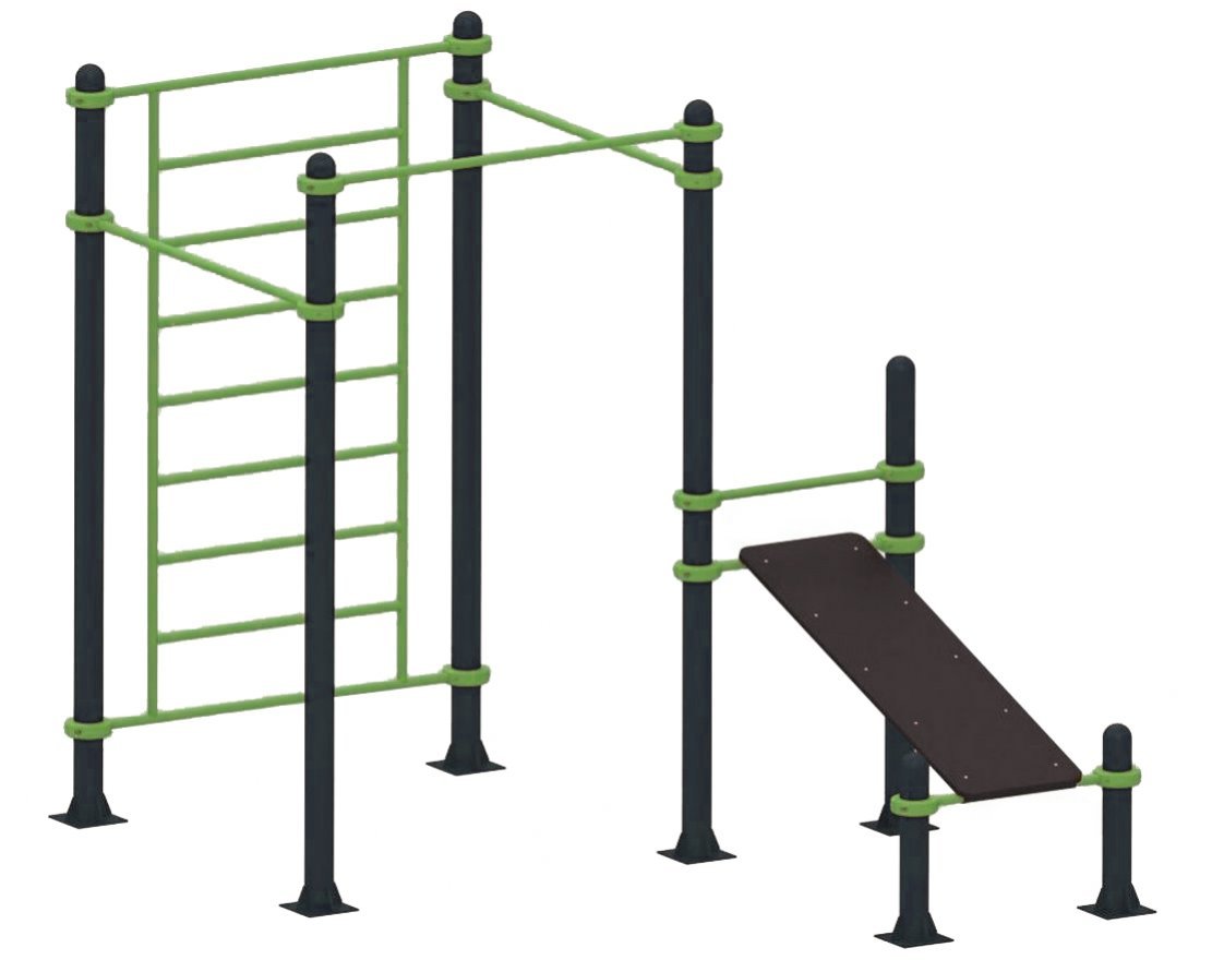 Комплекс включает в себя три функциональных элемента: уличный турник с регулируемой высотой перекладины, универсальную шведскую стенку и скамью для пресса. Все элементы разработаны с учётом безопасности и удобства пользователей.