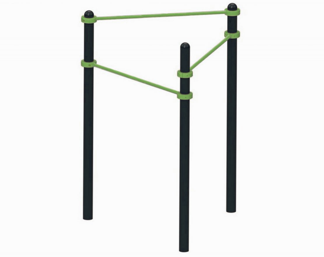 Комплекс состоит из трёх турников, которые регулируются по высоте с помощью хомутов. Это позволяет использовать его как детям, так и взрослым. Занятия на комплексе помогут укрепить мышцы пресса, рук, ног, плечевого пояса и спины, развить силу и выносливость.