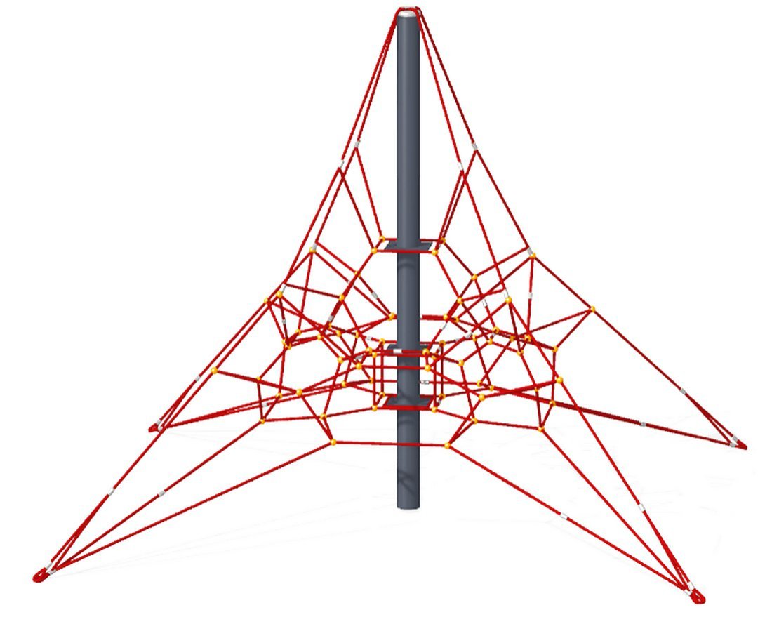 Для изготовления сетки используется армированный полипропиленовый 6-прядный канат, крестообразные соединители, оцинкованные коуши, обжимные алюминиевые втулки. Соединители могут быть двух видов: «яйца» (изготовлены из полиамида или алюминиевого сплава) или s-образные крючки из нержавеющей стали. Также в конструкции используются пластины из резинотканевой конвейерной ленты (EP-400/3 4/2 толщиной 9 мм, армирована тканевым слоем, отличается повышенной устойчивостью к механическому износу) — через них происходит крепление конструкции к опорной трубе. Сетка крепится к опорному столбу диаметром 108 мм, сверху на столб надевается металлическая вершина. С 4 сторон («лучами») конструкция крепится к поверхности игровой площадки с помощью талрепов, которые обеспечивают необходимое натяжение.