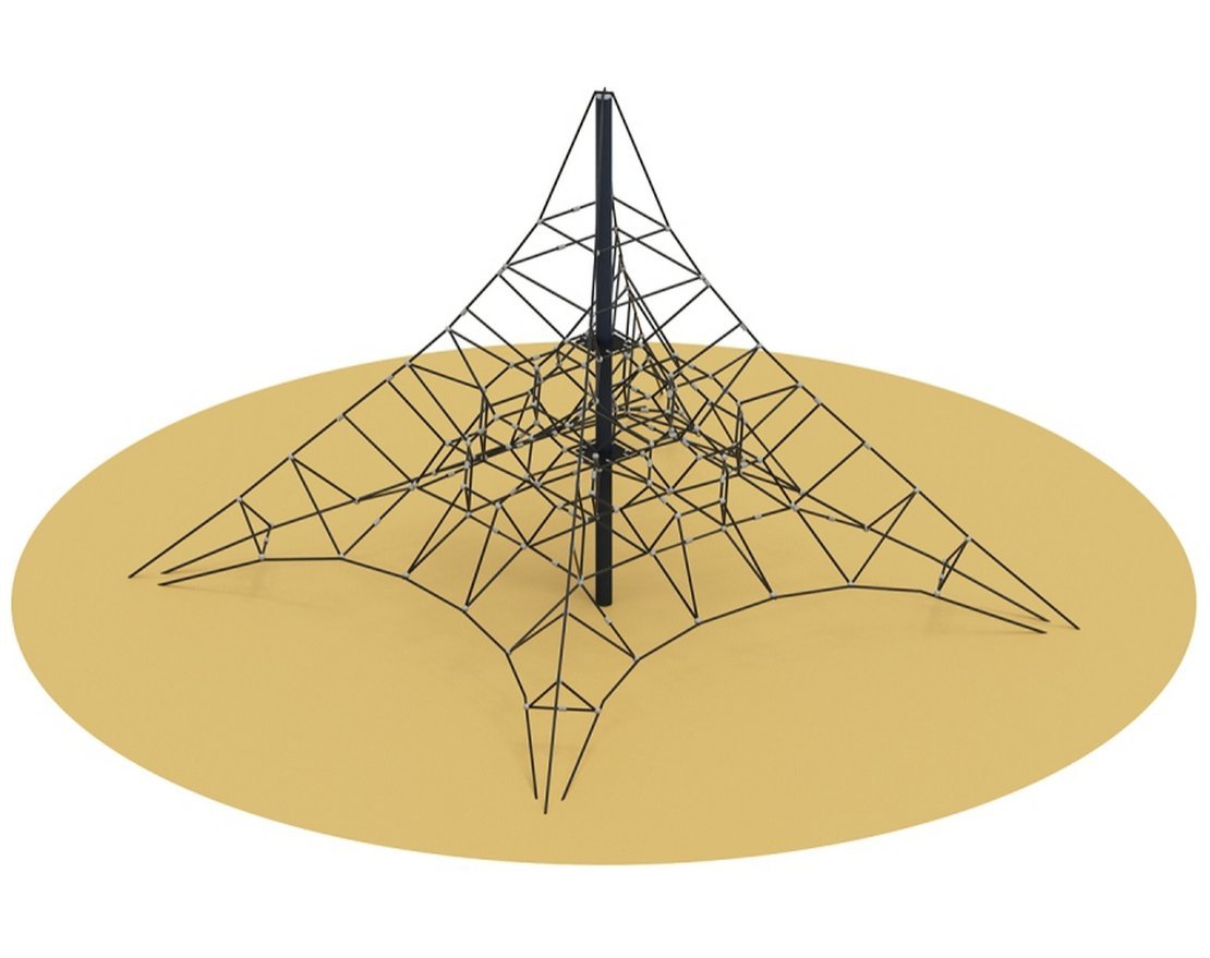 Для изготовления сетки используется армированный полипропиленовый 6-прядный канат, Х-образные соединители, оцинкованные коуши, обжимные алюминиевые втулки. Соединители могут быть двух видов: «яйца» (изготовлены из полиамида или алюминиевого сплава) или s-образные крючки из нержавеющей стали — на ваш выбор. Также в конструкции используются пластины из резинотканевой конвейерной ленты (EP-400/3 4/2 толщиной 9 мм, армирована тканевым слоем, отличается повышенной устойчивостью к механическому износу) — через них происходит крепление конструкции к опорной трубе. Сетка крепится к опорному столбу диаметром 108 мм, сверху на столб надевается металлическое навершие. С 4 сторон («лучами») конструкция крепится к поверхности игровой площадки с помощью талрепов, которые обеспечивают необходимое натяжение.