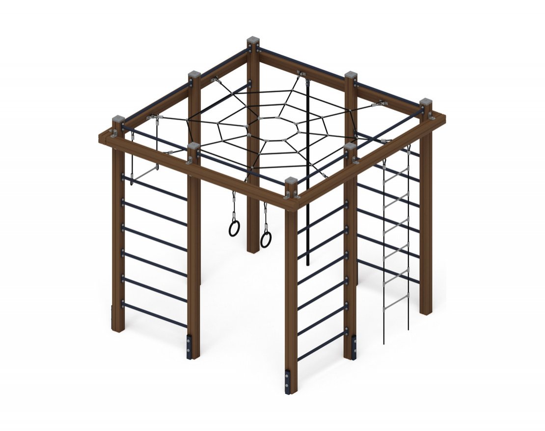Выполнена из шести-прядного армированного полиамидного каната тросовой свивки диаметром 16 мм, на брус обвязки стоек крепиться при помощи скоб через коуши. Канаты в местах пересечения фиксируются при помощи пластикового крестообразного соединителя для канатов диаметром 16 мм. Канаты помещаются в пазы соединителя, которые защёлкиваются между собой и фиксируются саморезом. Концы канатов заканчиваются коушем и фиксируются зажимной втулкой. Габариты 2370х2370 мм.