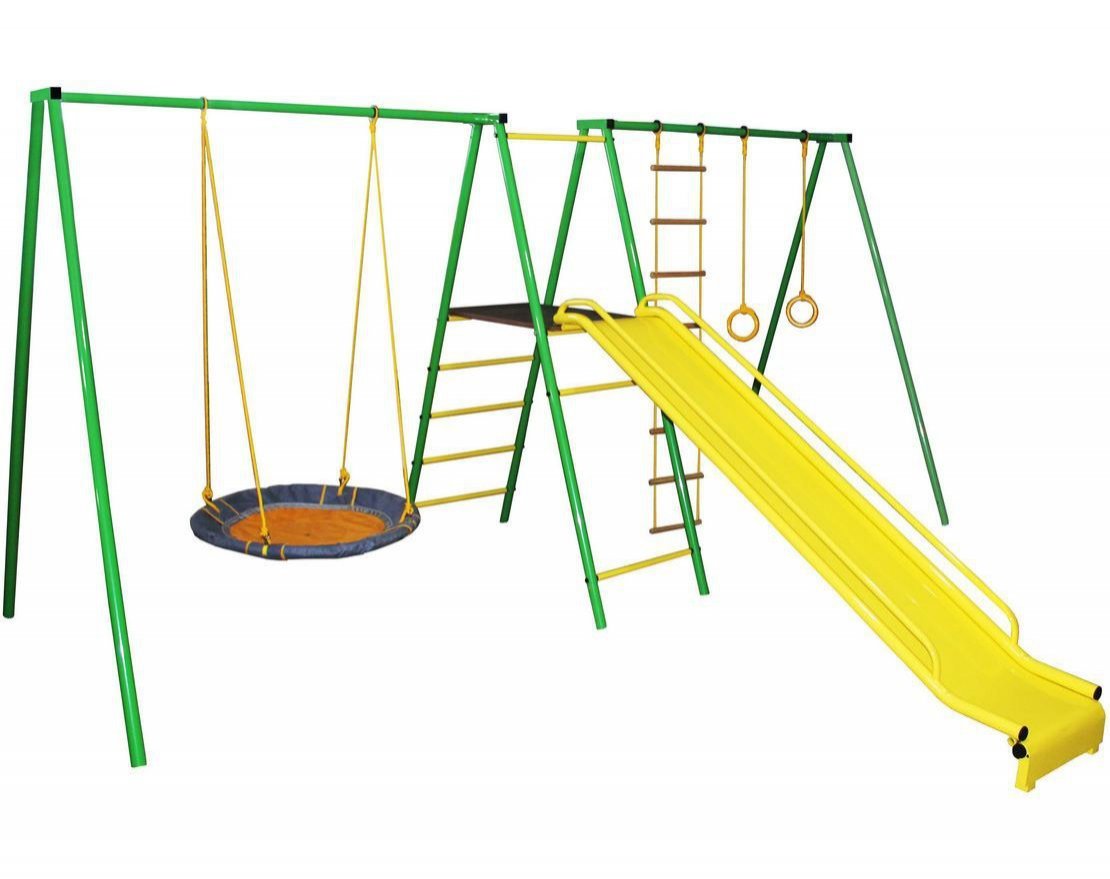 • В комплект входит: верёвочная лестница, гимнастические кольца, горка, качель-гнездо