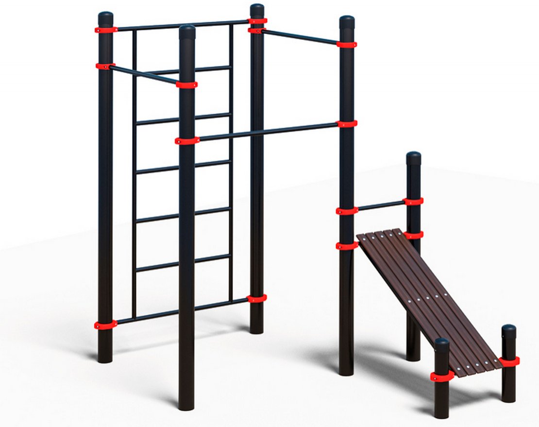 Комплекс устанавливается на семь опорных столбов из толстостенной трубы с порошковым покрытием. Столбы имеют длину от 0,55 до 2,6 метра. К столбам крепятся аксессуары: лавка, шведская стенка и перекладины.
