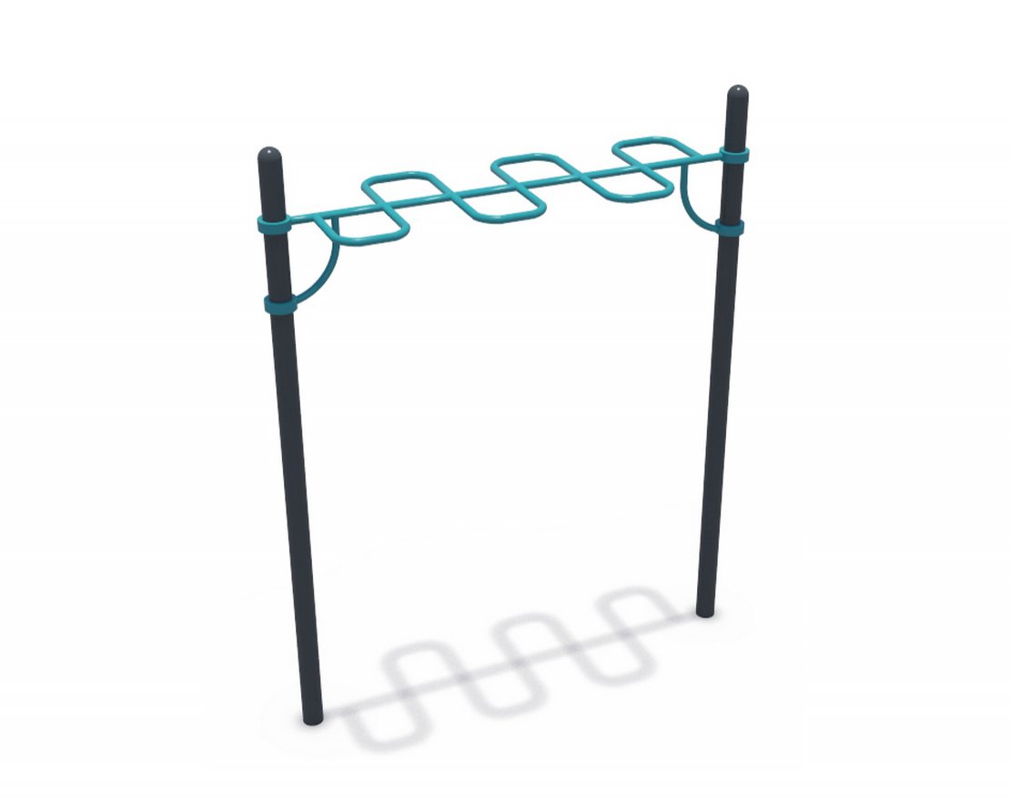 Этот спортивный комплекс предназначен для подростков старше 13-ти лет и изготовлен из профильных труб **Ø 89 мм или Ø 108мм в виде вертикальных опорных столбов и рукохода Ø32мм, который крепится к столбам с помощью специальных хомутов Ø140мм.