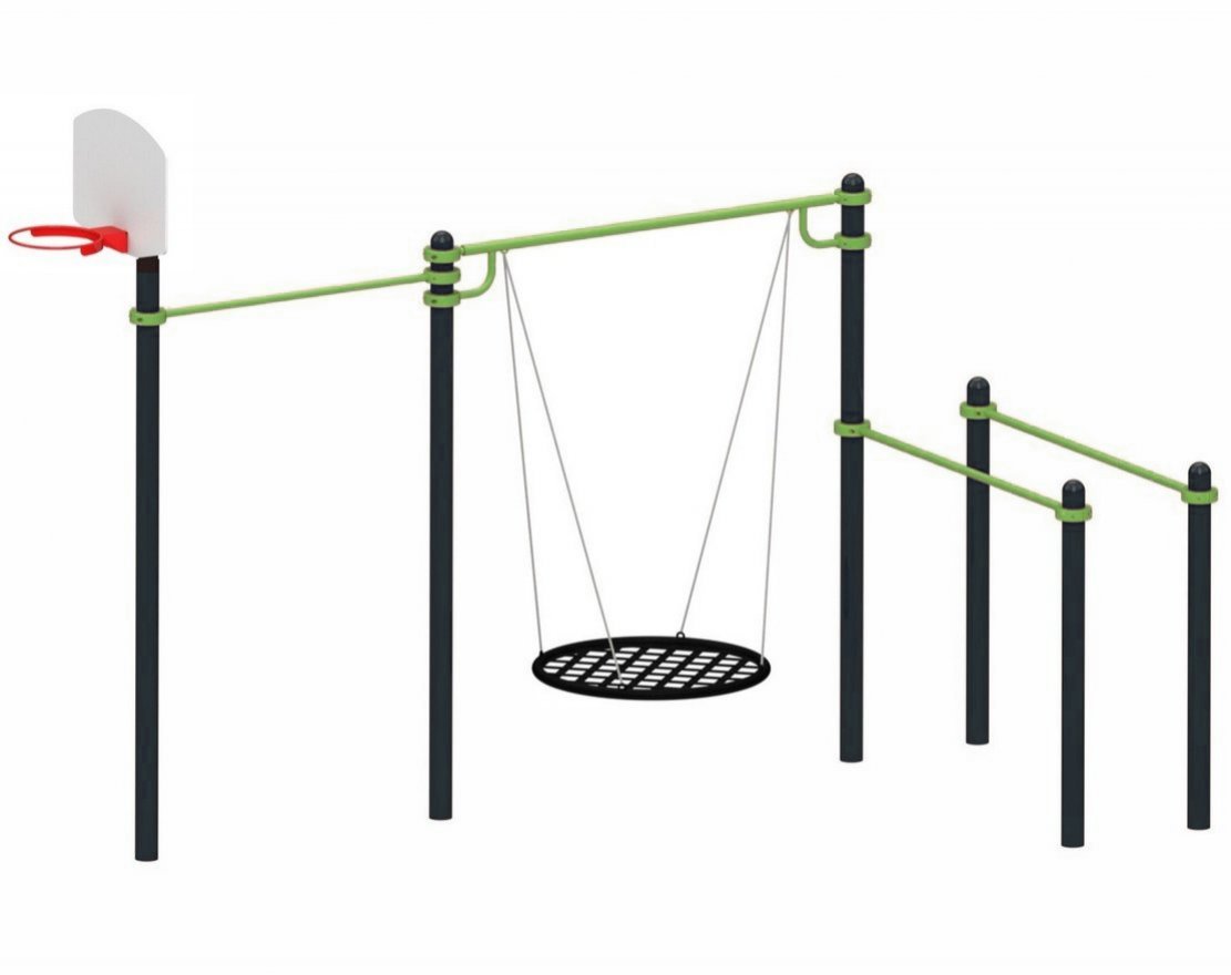 Данный комплекс поможет подготовится к сдаче нормативов, а также расслабиться на качелях-гнездо и поиграть в баскетбол. С его помощью укрепляются мышцы пресса, ног, рук, плечевого пояса, груди и спины. Отлично подходит для занятий физкультурой и спортом. Может использоваться в качестве составной части площадки для воркаута. Части оборудования отлично дополняют друг друга, а хомуты позволят отрегулировать, как высоту установки, так и расположение площадки в плане.