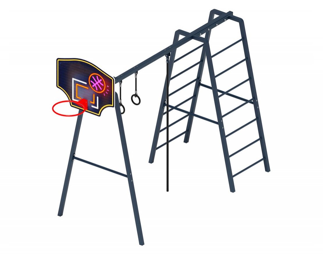 • В комплект входит: верёвочная лестница, канат, гимнастические кольца, шведская стенка, баскетбольное кольцо