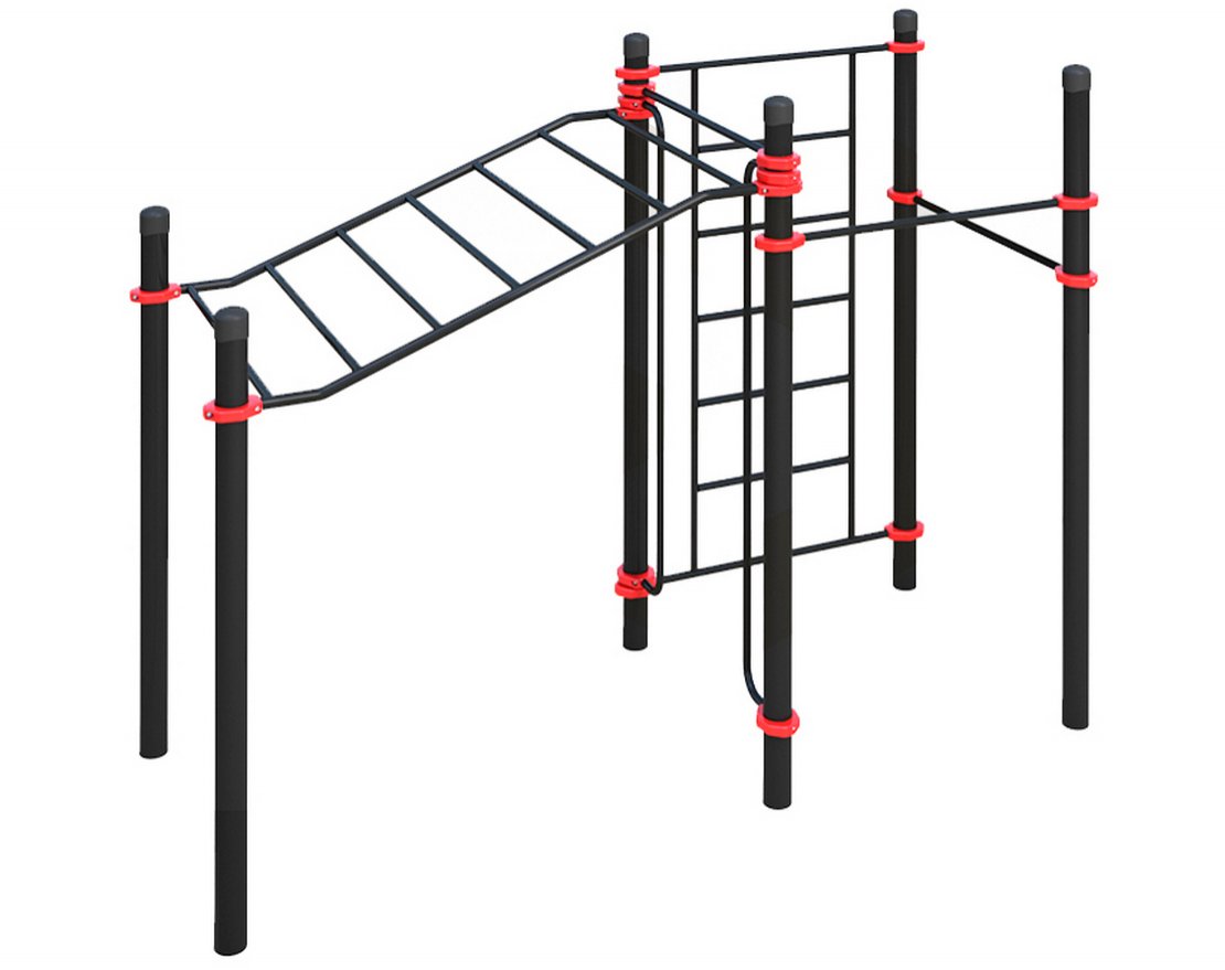 Все элементы комплекса надёжно крепятся к опорными столбам с помощью хомутов, что обеспечивает их устойчивость и безопасность.