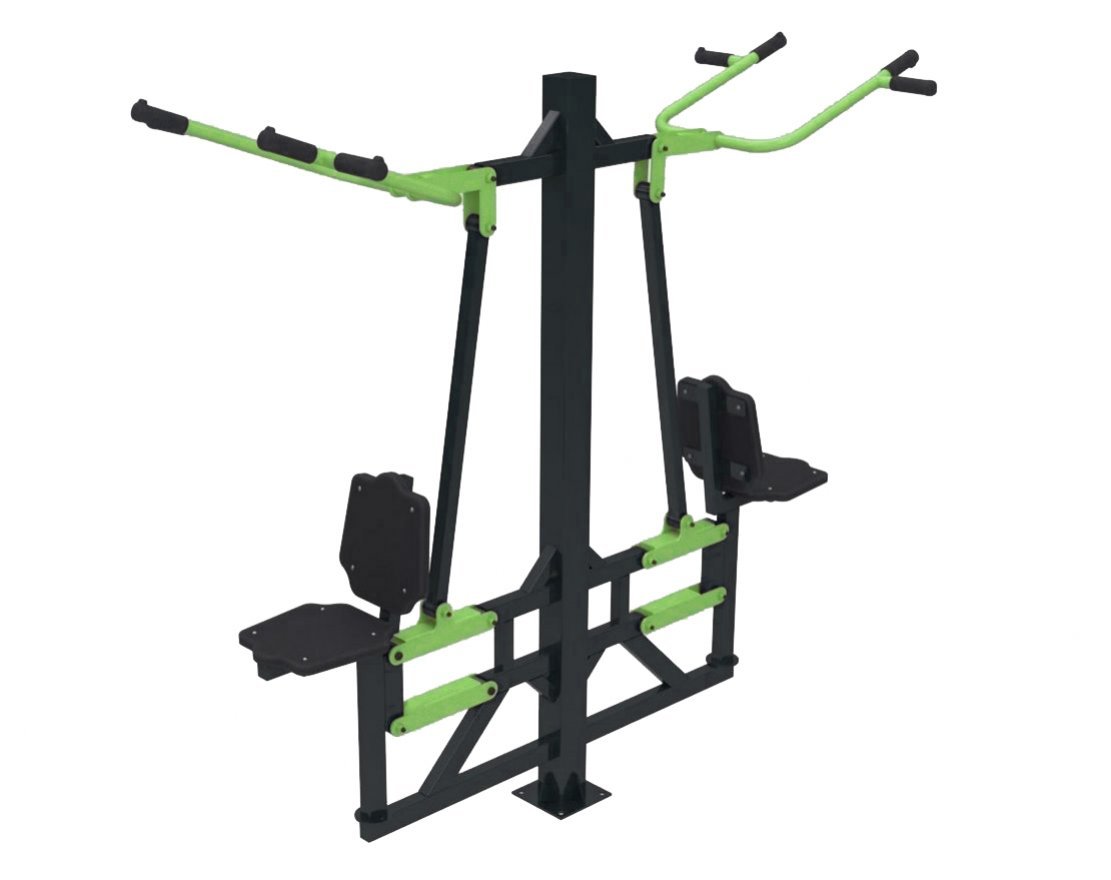 Уличный тренажёр «Вертикальная тяга» — это изделие из прочной стали с подвижной рычажной системой, предназначенное для тренировки мышц трицепсов, груди и других групп мышц. Тренажёр оснащён сиденьями и рифлёными рукоятками из антивандального пластика, что делает его безопасным и долговечным.